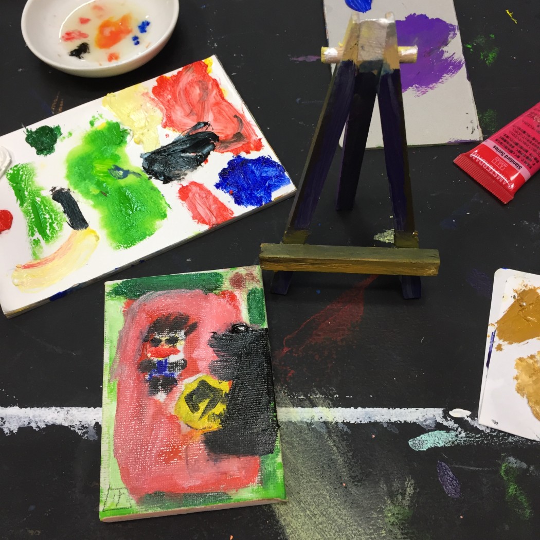 手のひらサイズの小さいキャンバスに絵を描くワークショップです。ミニイーゼルもセットになります。