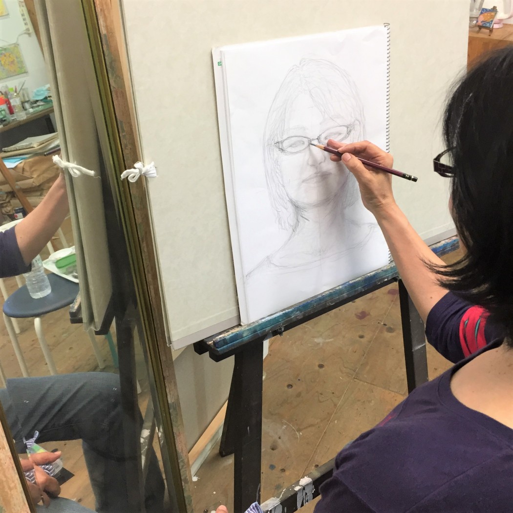 9月にはいり、大人クラスでは「自分の頭部を木炭デッサンで描く」自主課題の生徒さんがいらっしゃいました。第1回目にまずは構図を決めるクロッキーをして、顔の角度や細部の描きかたなどをレクチャーします。