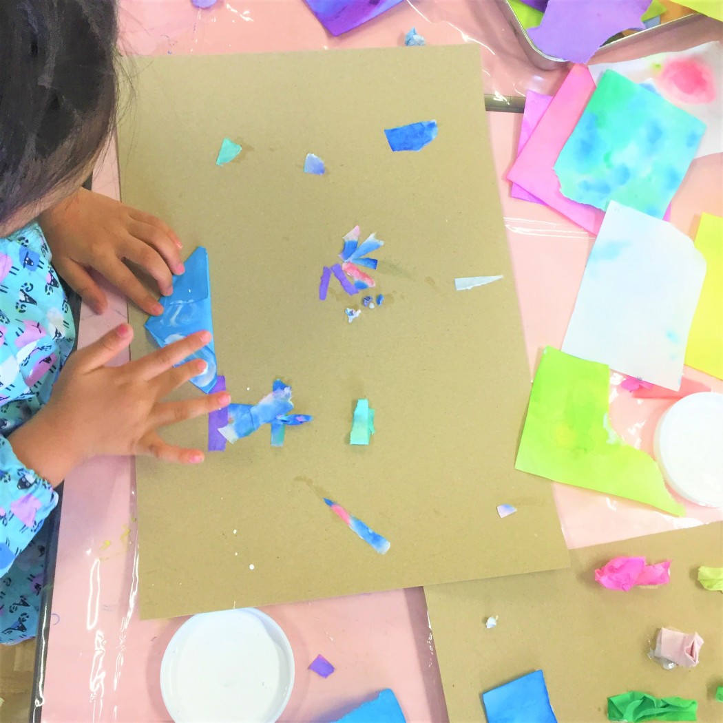 和紙を絵の具で染めて、ちぎり絵をつくります。ちぎり絵を飾るかっこいい額もつくります。