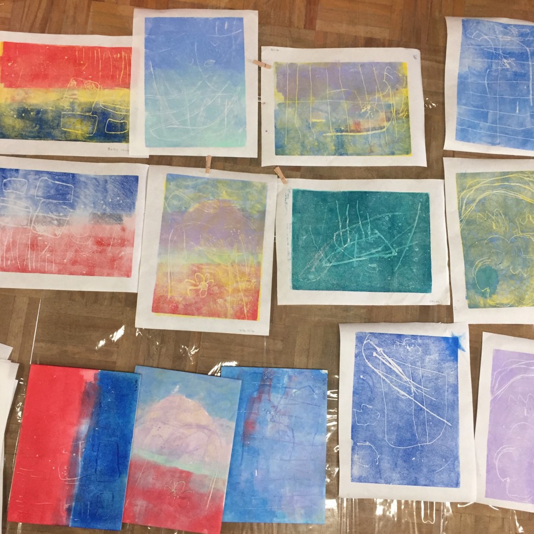 スチレンボードに線や点をうって版画にします。2色刷りにも挑戦します。